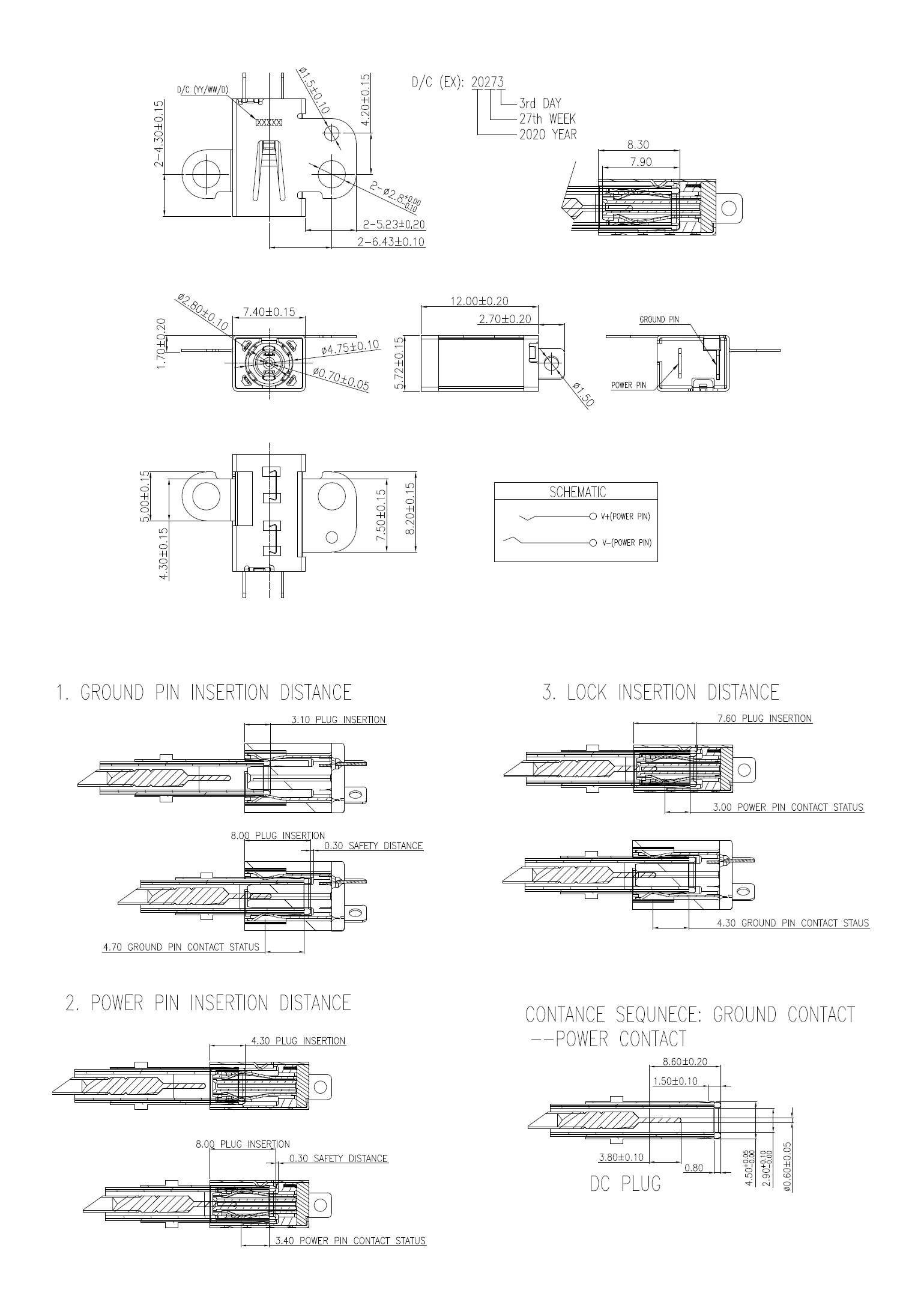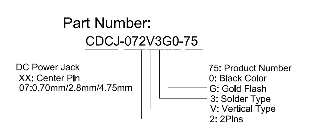 DC Power Jack, 0.70mm/2.80mm/4.75mm, 2Pins, Vertical, Solder Type With Holes, Gold Flash, With Shielding, H=5.72mm, LCP, Black Color, Support 20V 12A