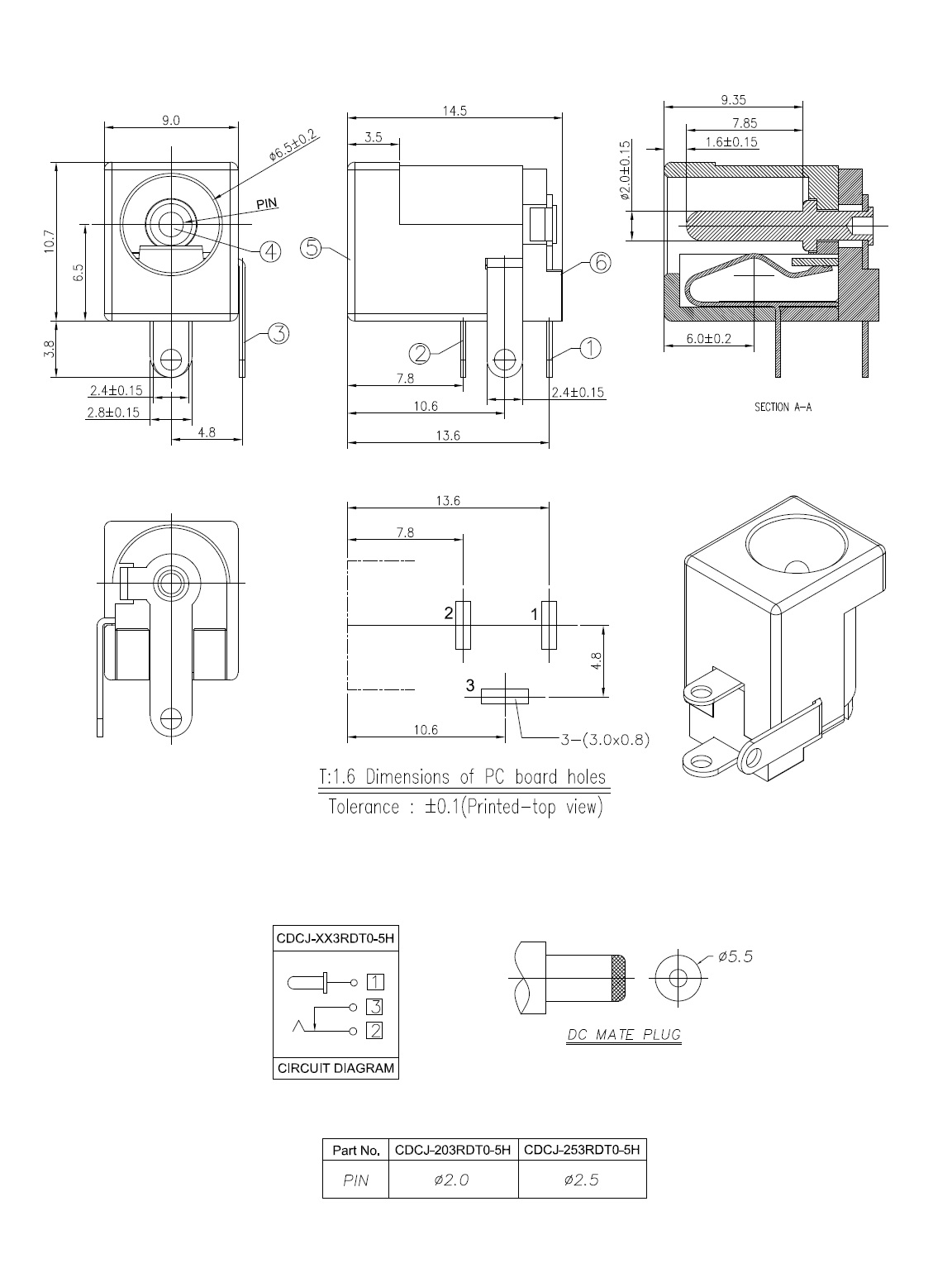 DC Power Jack, 2.0mm/6.4mm, Right Angle, DIP, H=11.0mm, at 24V 5A Rated, PBT, Black Color
