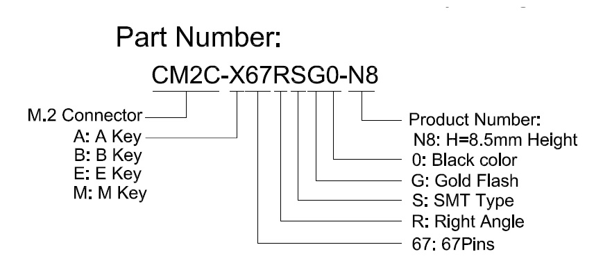 M.2 Card Edge Connector, M Key, 67Pins, Right Angle, SMT, Gold Flash, H=8.5mm, High Temperature Plastics, Black Color