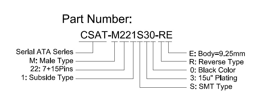 Serial ATA 22Pins, Male, Subside, SMD, 15u" Plating, Reverse Type, Body=9.25mm, H=2.3mm, LCP, Black Color, With Cap