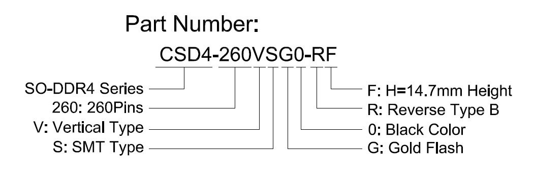 SO-DIMM DDR4, 260Pins, 1.2V, Vertical, SMT, Gold Flash, Reverse Type B, H=5.8mm/14.7mm Height, Black Color