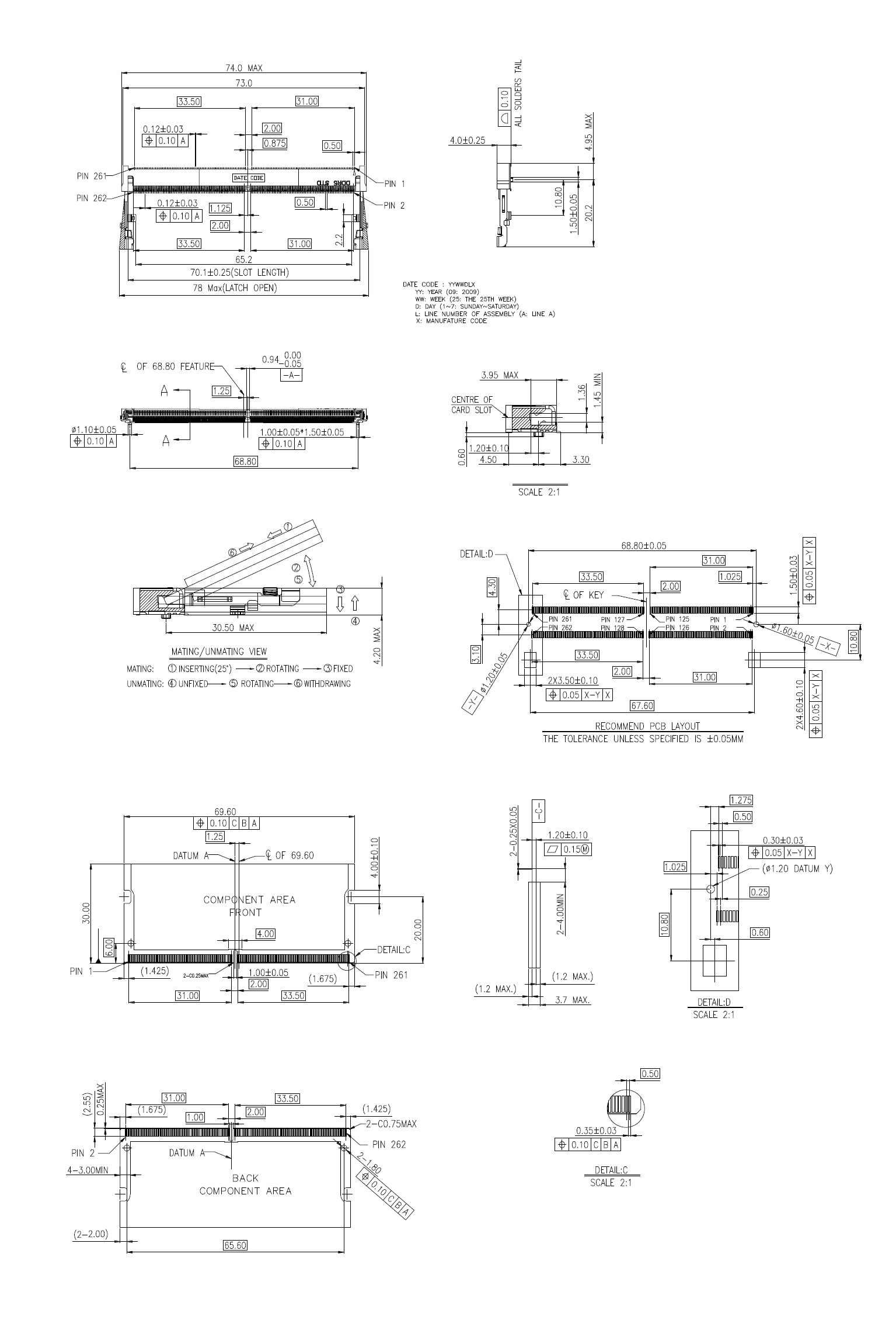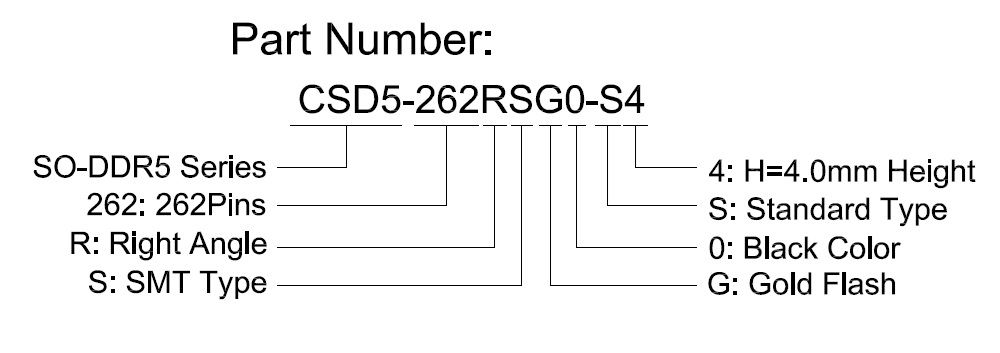 SO-DIMM DDR5 Connector, 262Pins, 1.1V, Right Angle, SMT, Gold Flash, Standard Type, H=4.0mm Height, Black Color