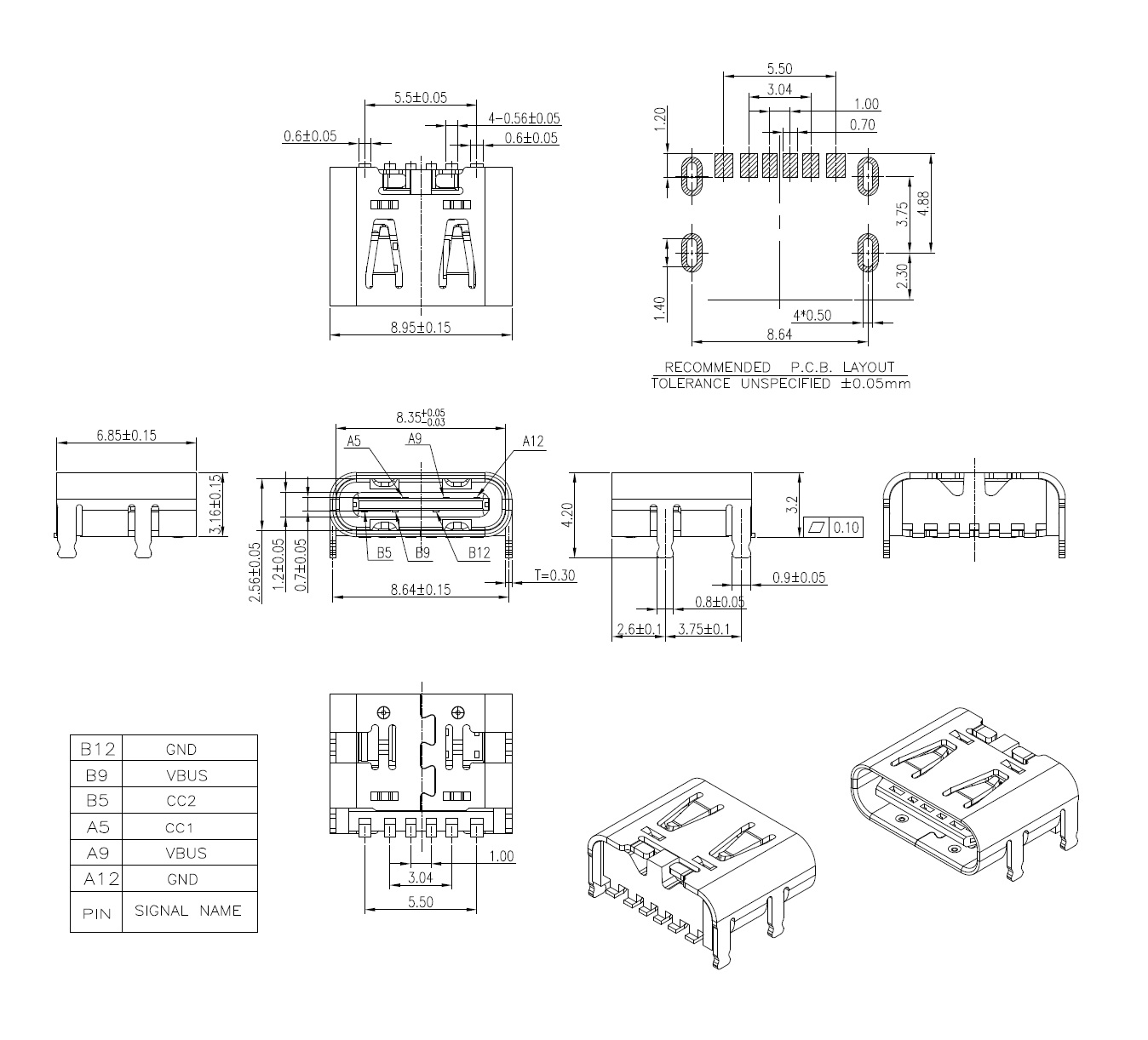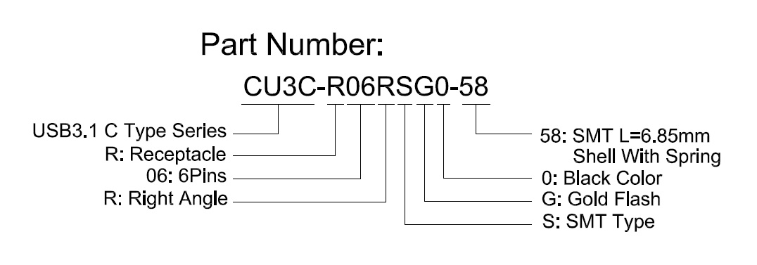 USB 3.1 C Type, 6Pins, Receptacle, Right Angle, SMT, Gold Flash, Short Body L=6.85mm, Shell With Spring, H=3.20mm, LCP, Black Color
