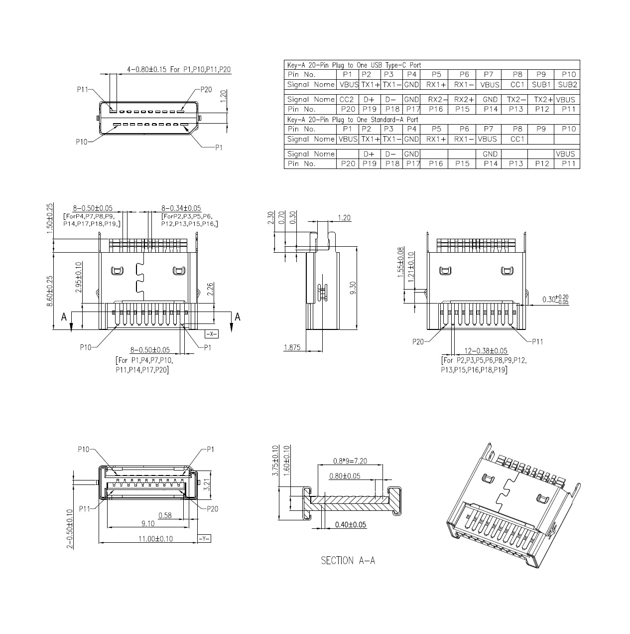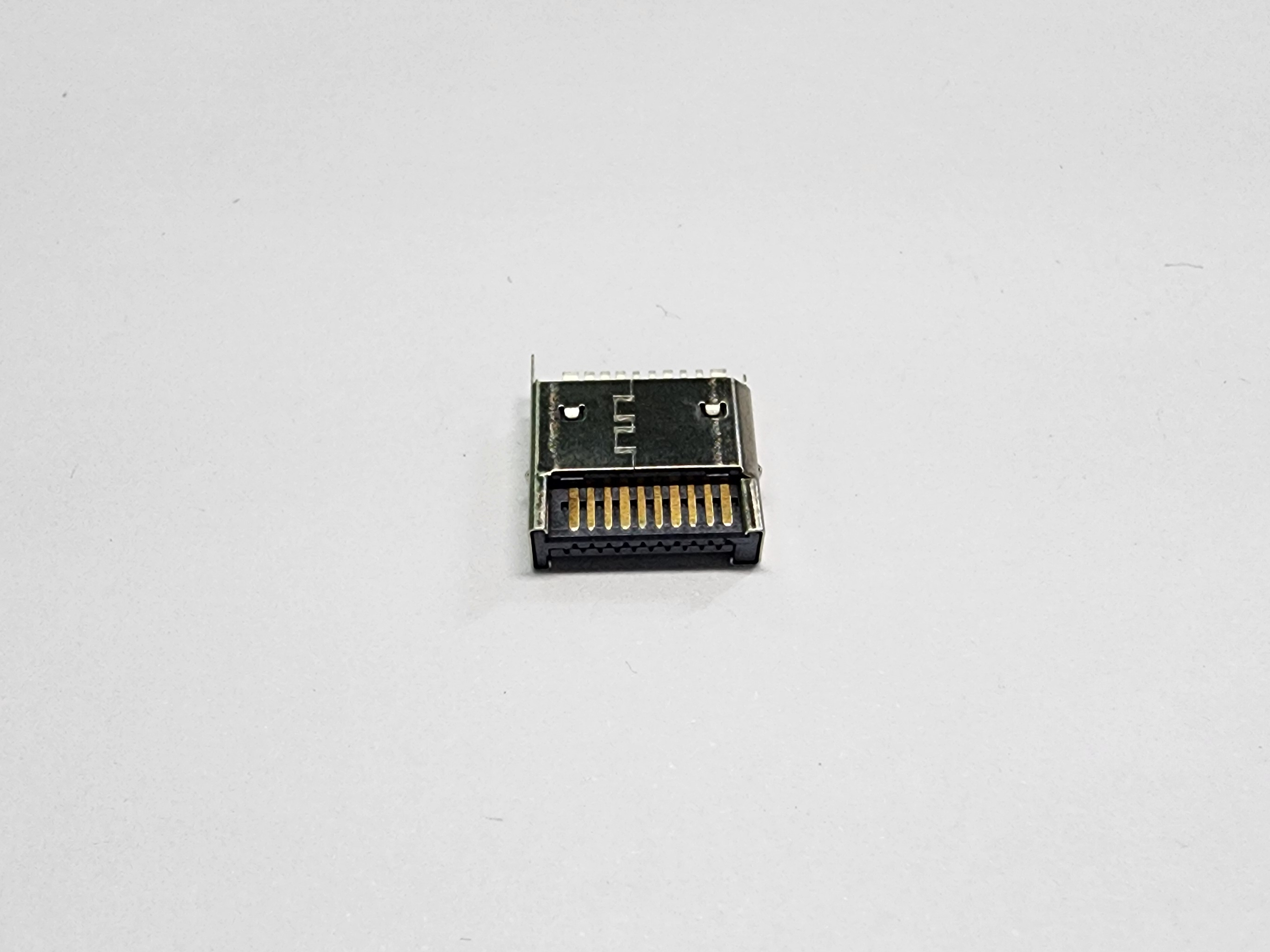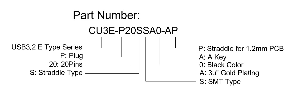 USB 3.2 Type E, Plug, 20Pins, Straddle Type, SMT, 3u" Gold Plating, A Key, With Stainless Steel Shell, LCP, Black Color, for PCB 1.2mm Thickness