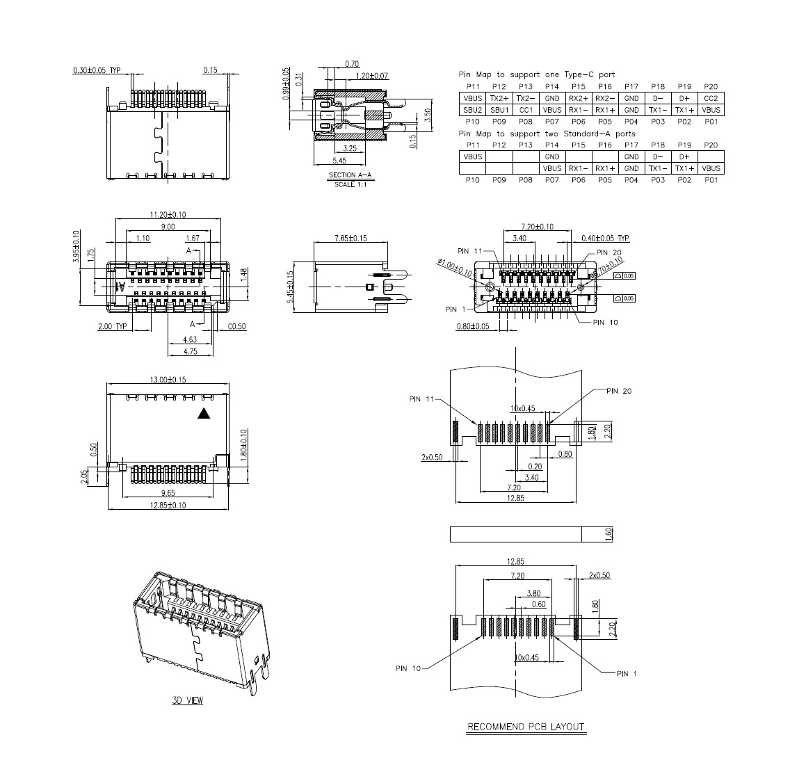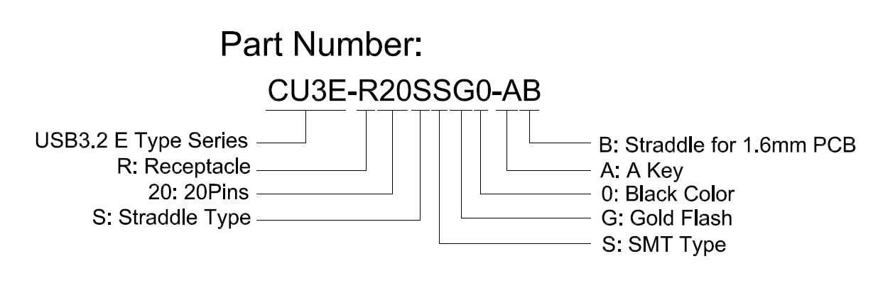 USB 3.2 Type E, Receptacle, 20Pins, Straddle Type, SMT, Gold Flash, A Key, With Stainless Steel Shell, H=7.85mm, LCP, Black Color, for PCB 1.6mm Thickness
