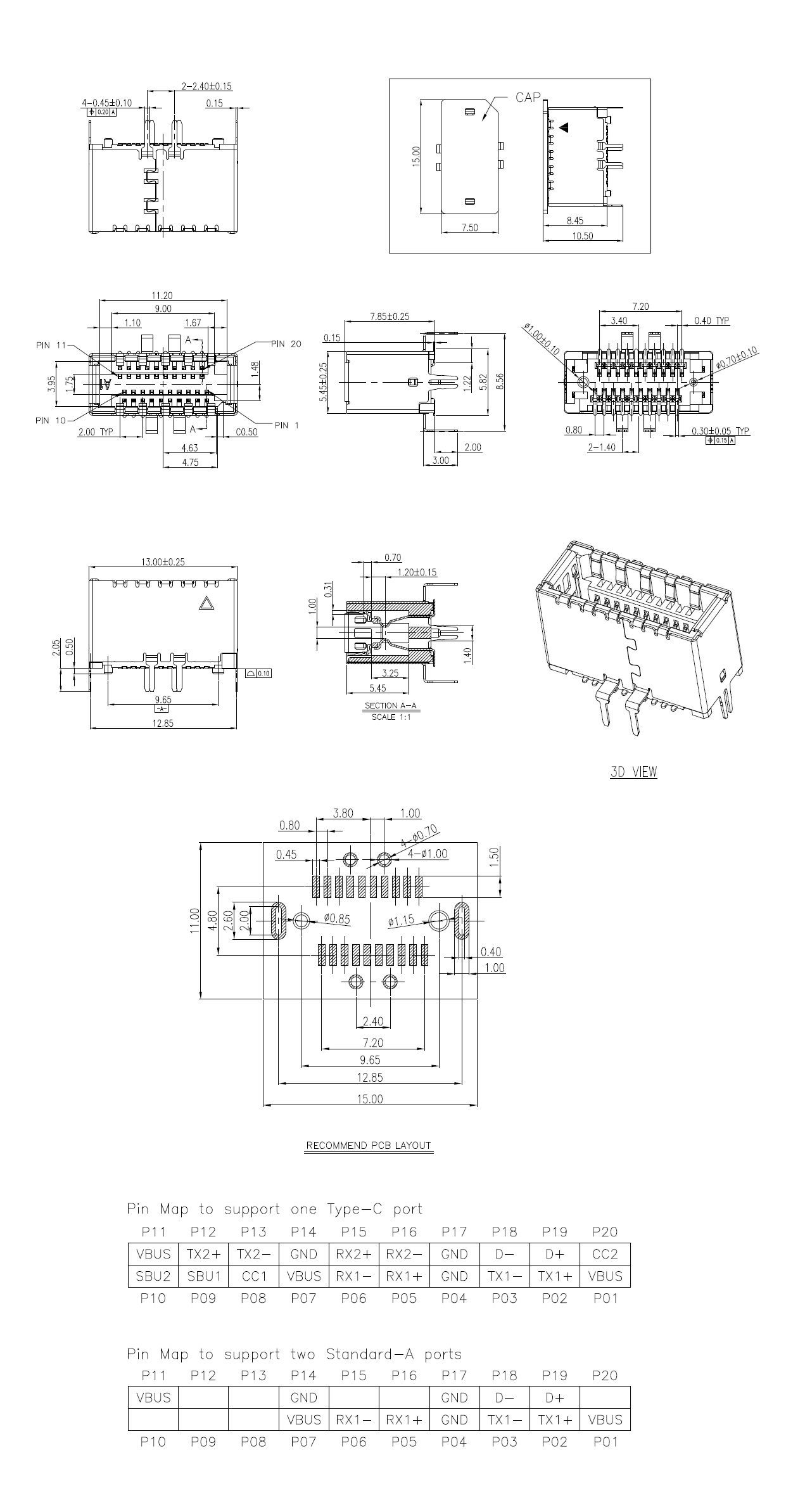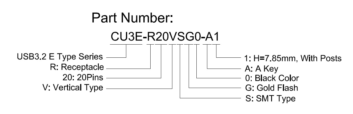 USB 3.2 Type E, Receptacle, 20Pins, Vertical, SMT, Gold Flash, A Key, With Stainless Steel Shell DIP, H=7.85mm, LCP, Black Color