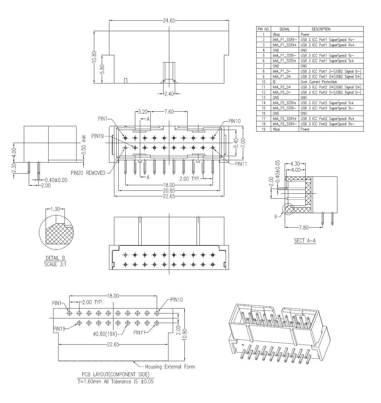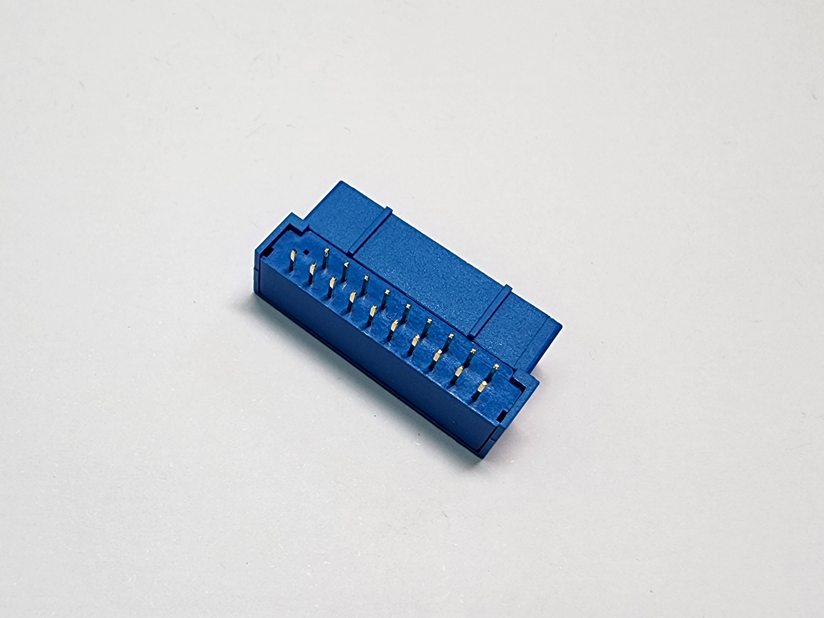 USB 3.0 Internal Type, 19Pins, Receptacle, Right Angle, Gold Flash, DIP 2.3mm, Nylon 66, Blue Color