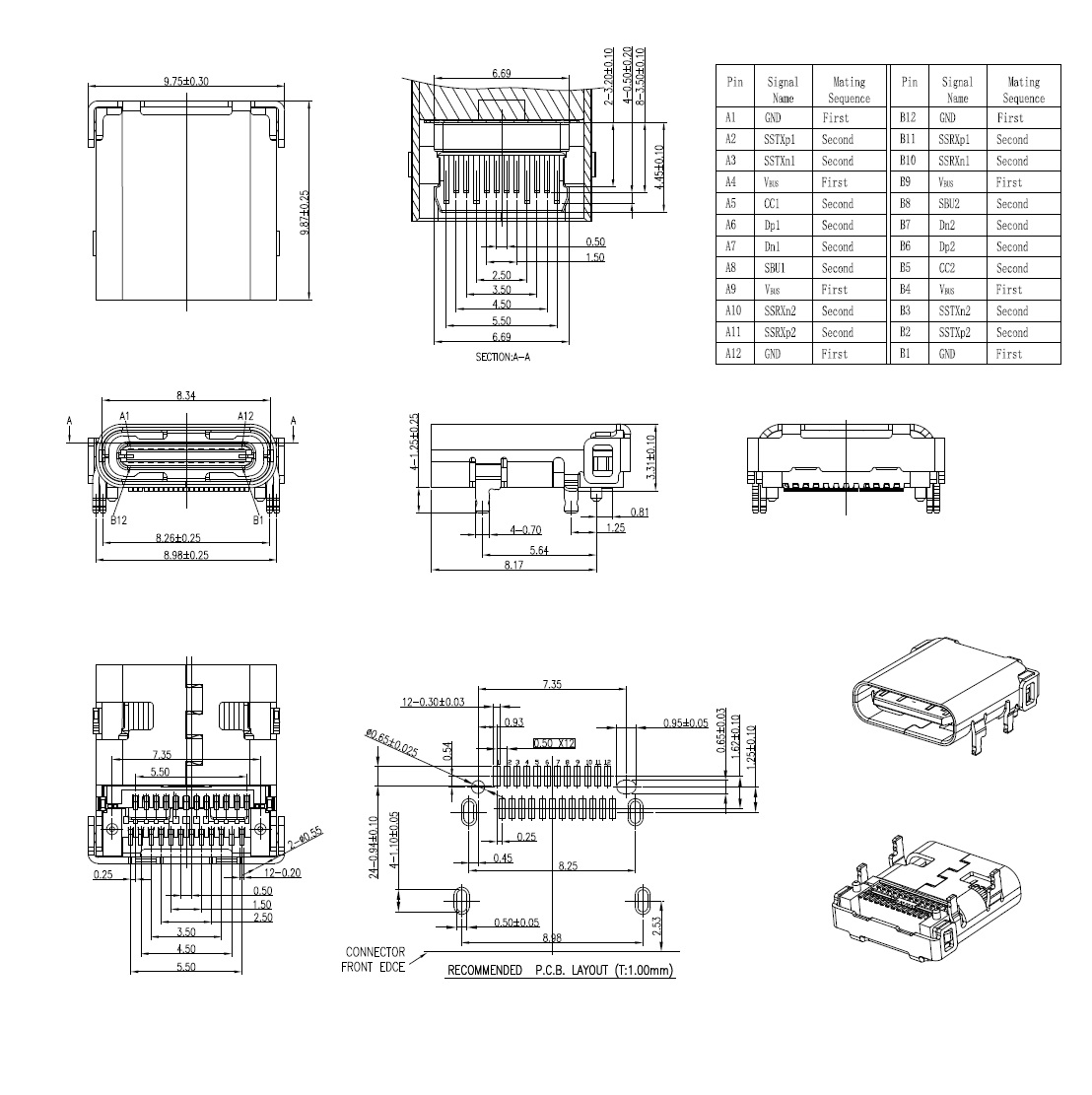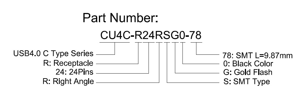 USB4.0 C Type, Gen3, 24Pins, Receptacle, Right Angle, Dual Rows SMT, Gold Flash, Body L=9.87mm, PA9T, Black Color