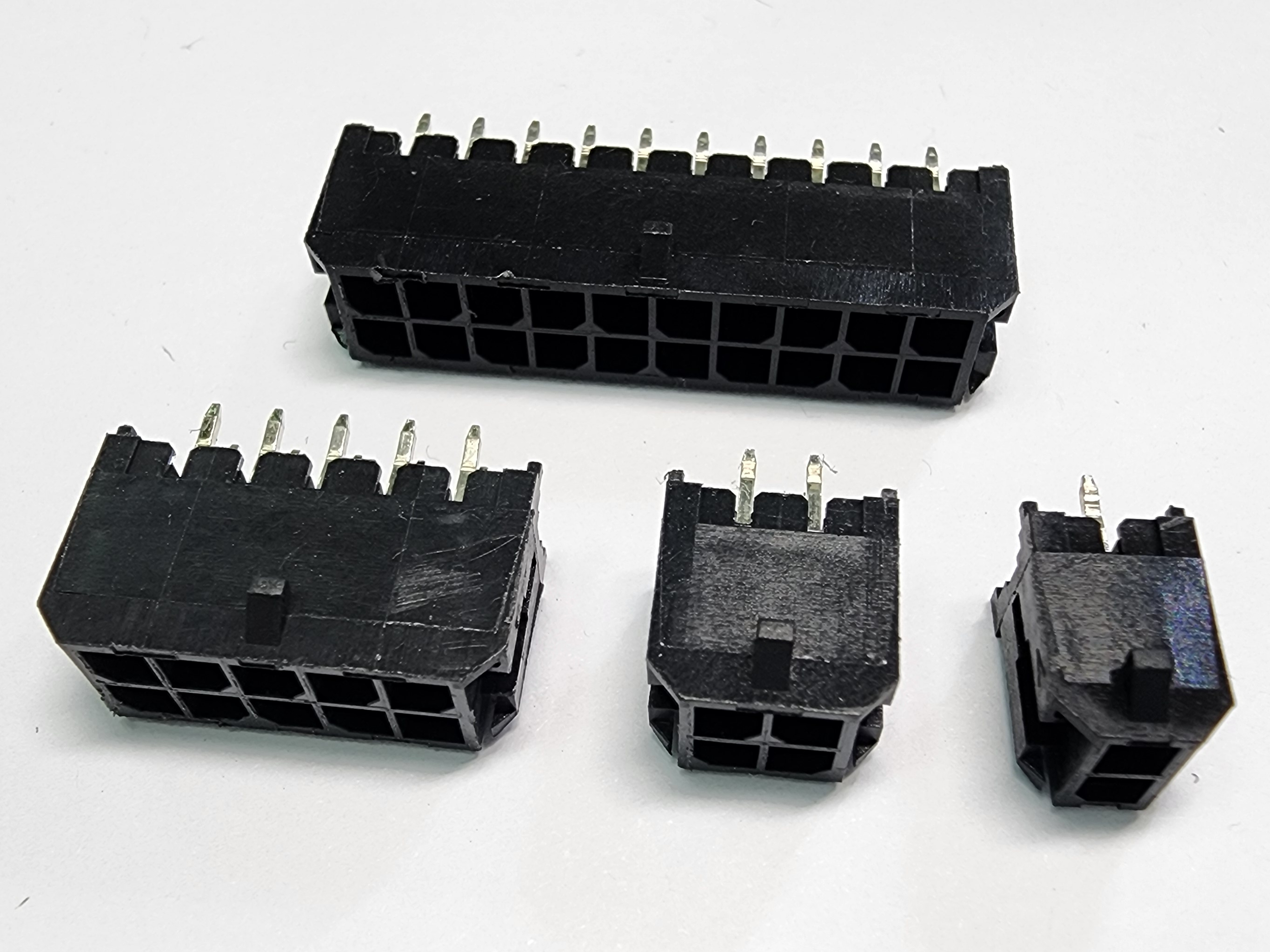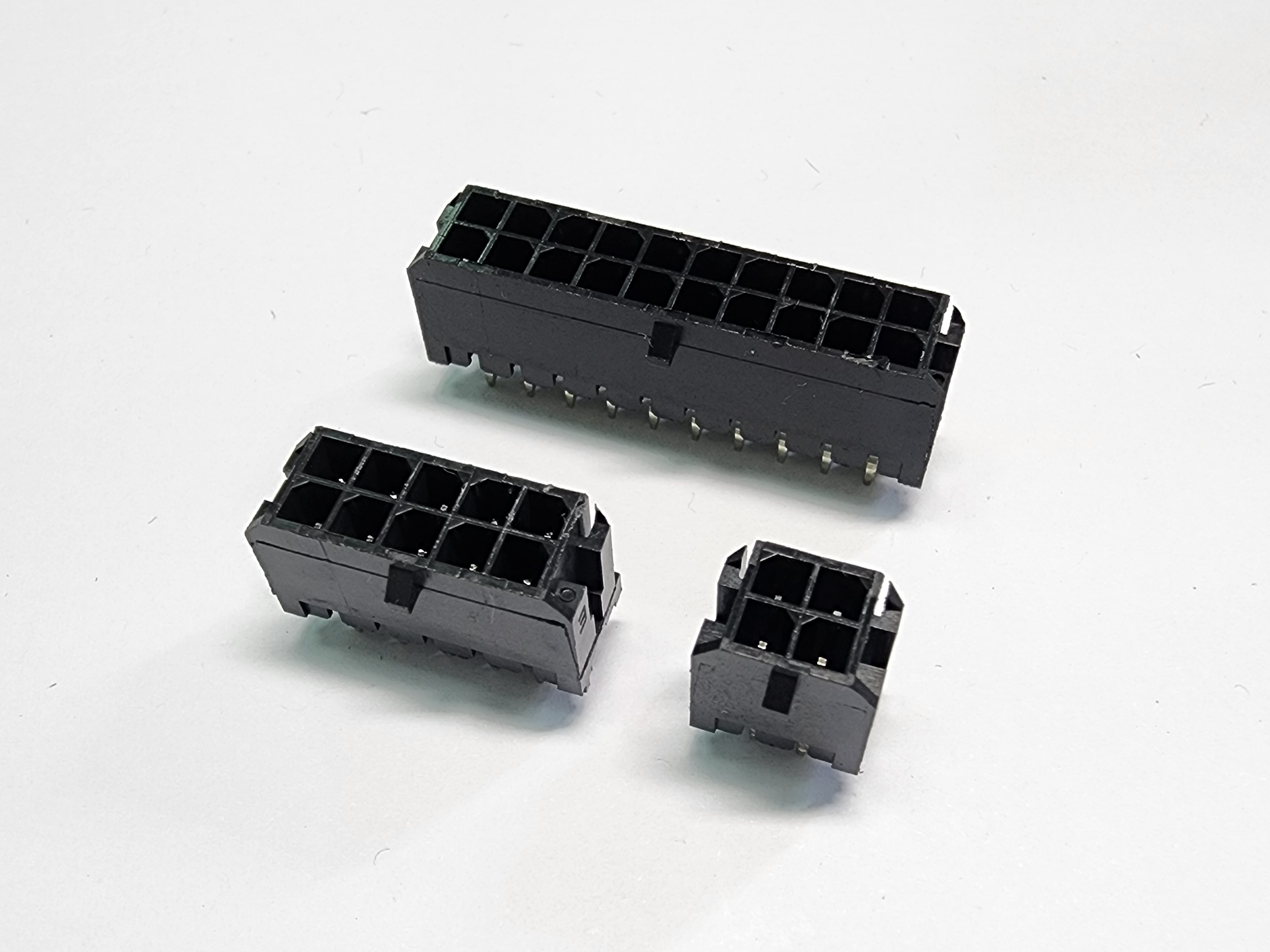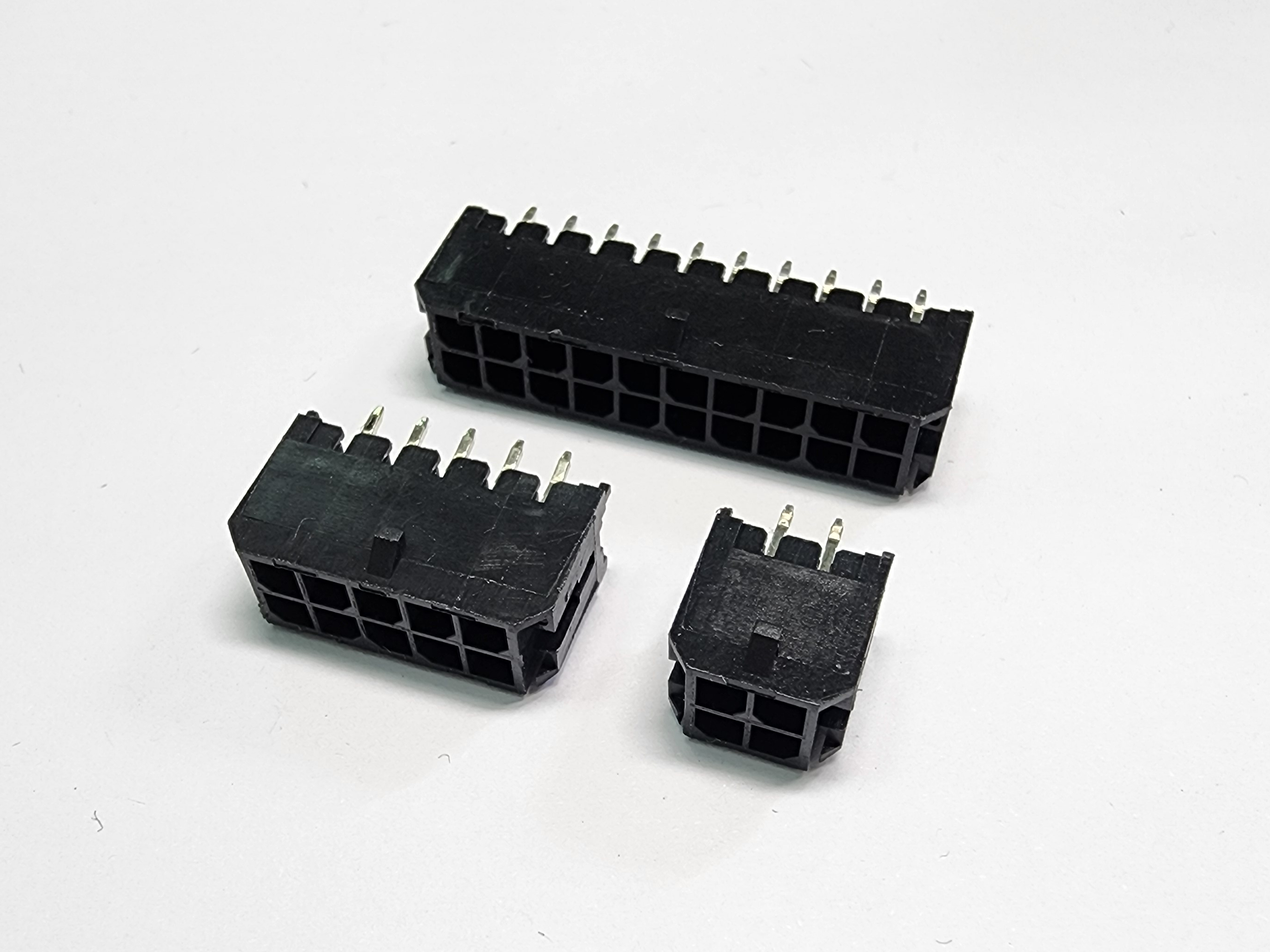 Micro-Fit, Double Rows, 3.0mm Wire to Board Power Connector, 2x1~2x12Pins, Right Angle, DIP, With Posts, Black Color