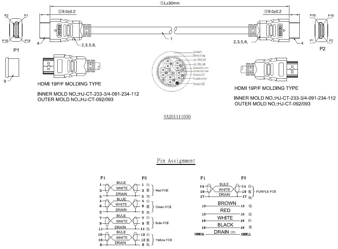 • Print Word: "E189529  AWM  20276  80℃ 30V HDMI cable"